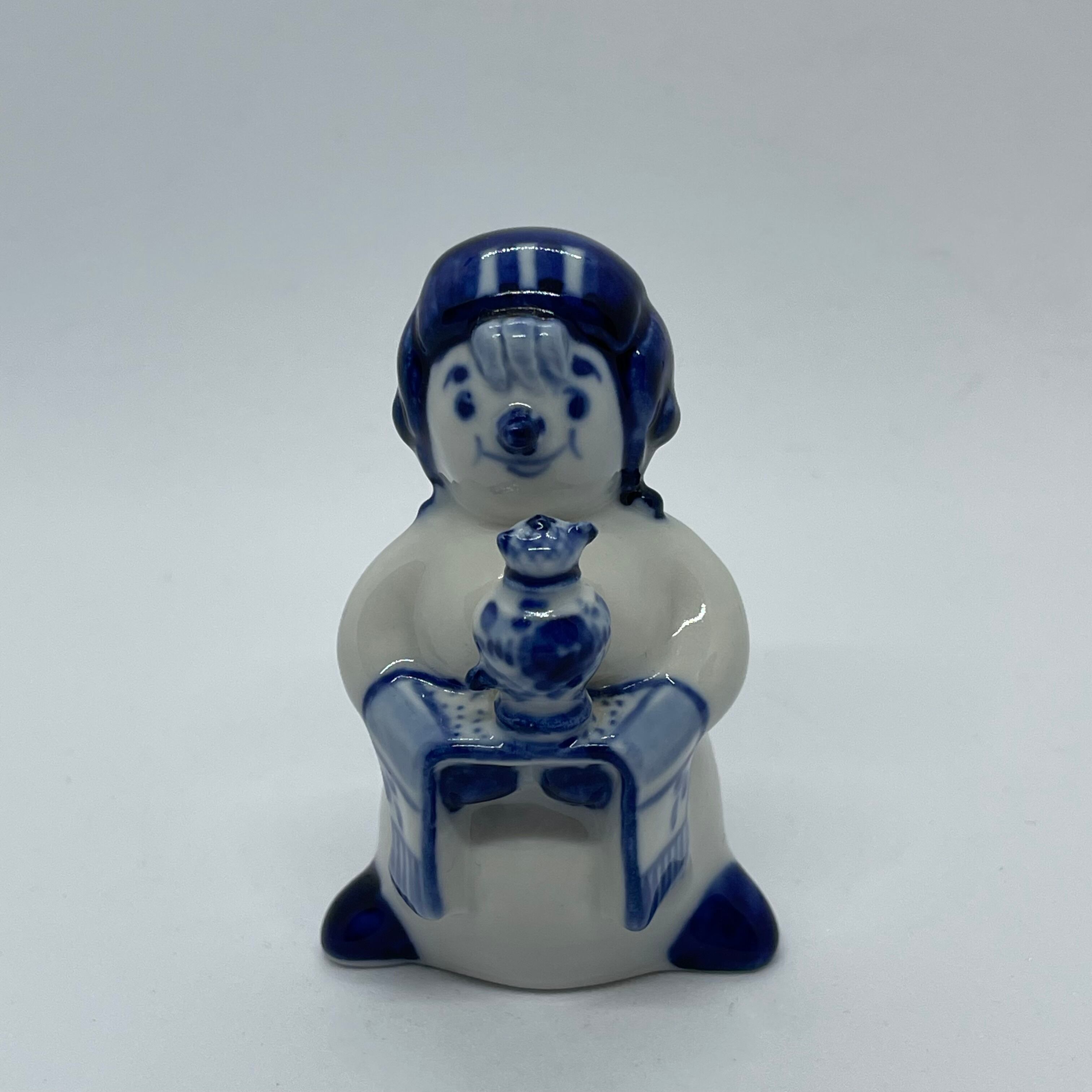 こちらはモスクワ国際アイスホッケー大会のマスコット「雪だるま」です。まるでトロフィーのようにサモワールを抱えていますね。凝った細工と絵付けが見事です♪
